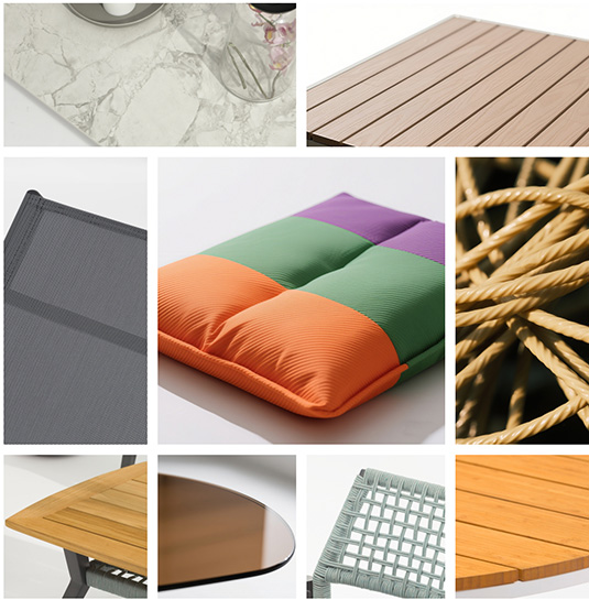 In terms of material combinations, we demonstrate exceptional ingenuity. The aluminum frames are perfectly paired with various outdoor materials such as textilene fabric, webbing, plastic wood, sintered stone, glass, teak bamboo panels, etc. The textilene fabric is breathable and wear - resistant, ensuring a comfortable sitting experience; the webbing is available in a rich variety of colors and offers diverse shapes; the plastic wood is environmentally friendly and durable, combining the texture of wood with the advantages of plastic; the sintered stone is heat - resistant and easy to clean; the glass adds a transparent and elegant touch, enhancing the style of the space; the teak bamboo panels exude a natural and rustic charm. Meanwhile, we keep up with global material innovation trends, continuously introducing new types of outdoor materials, such as nano - coated materials with self - cleaning functions and special fabrics with intelligent temperature control. This enables us to continuously infuse our products with technological and fashionable elements, and produce marketable products that meet the demands of different regions and markets.