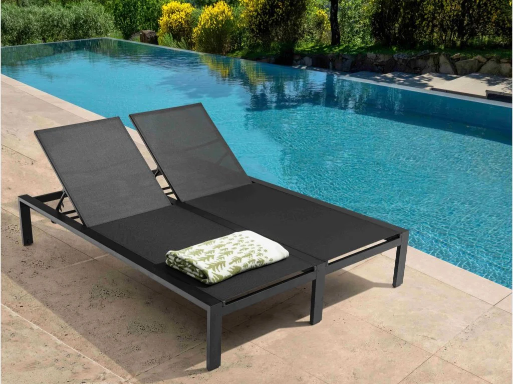 Poolside lounge furniture now mirrors boutique hotel esthetics and brings vacation living to residential patios . The aluminum outdoor chaise lounge adapts well to this trend. It comes in various frame finishes, strap colors and fabric styles to match resort themes from modern to tropical . Powder-coated finishes allow for diverse colors and textures that ensure integration with specific décor visions.