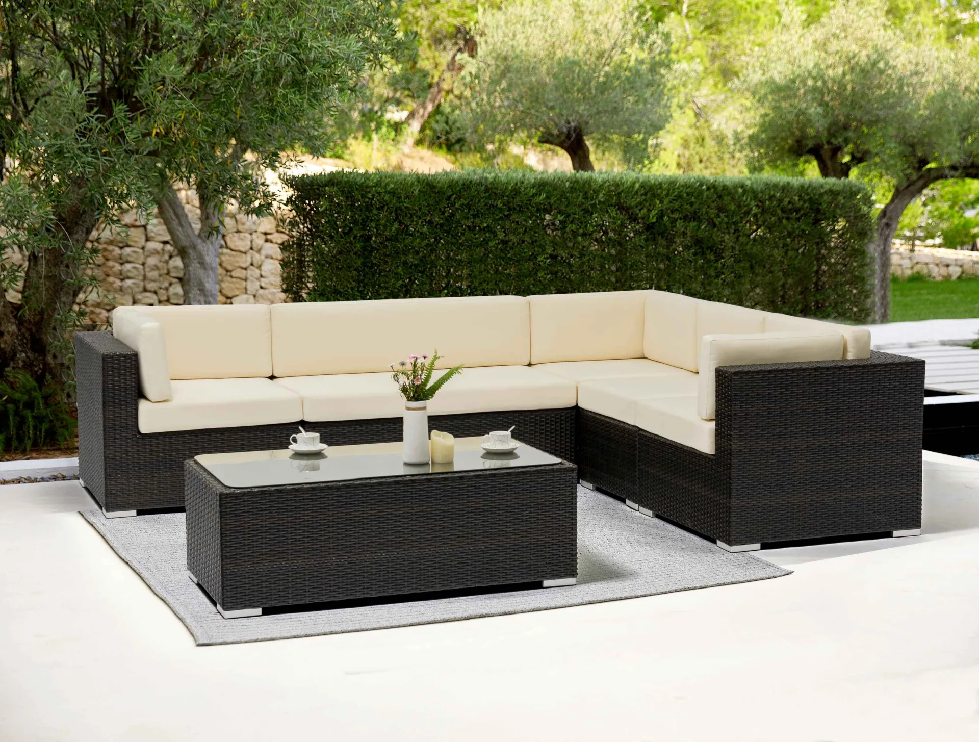Aluminium alloy frame   Water-resistant fabric    High resilience sponge    Automotive-grade Outdoor Tempered Glass    Durable and Sun-resistant PE Rattan