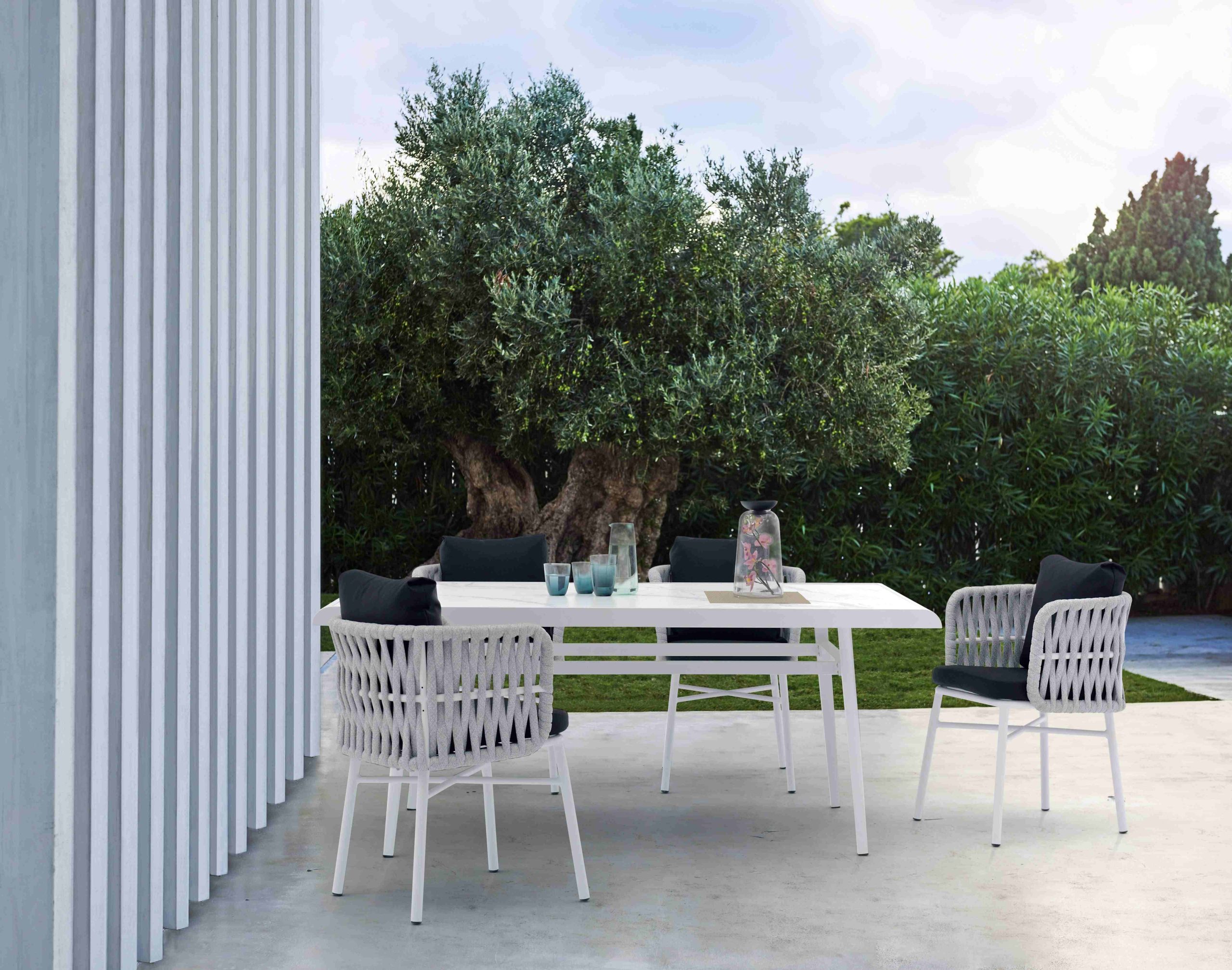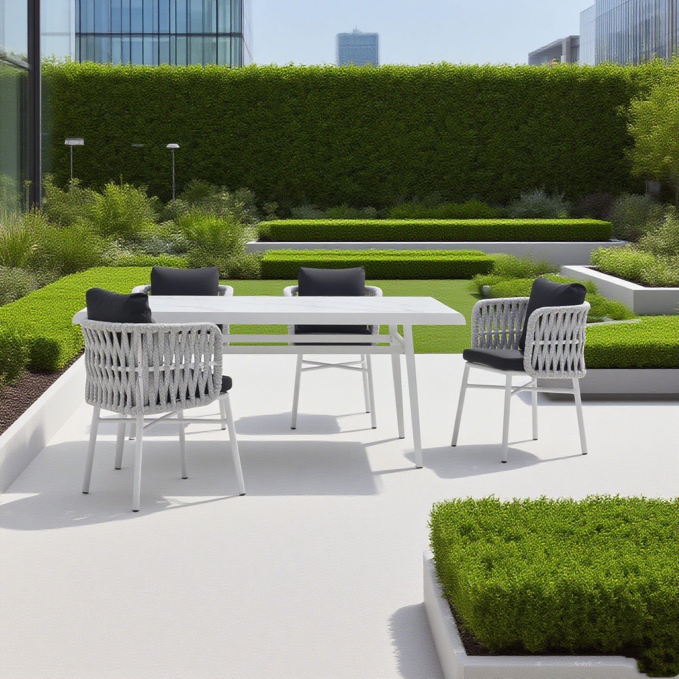 Aluminium Stone glass (Table top) Polyester(Cushion,Rope)